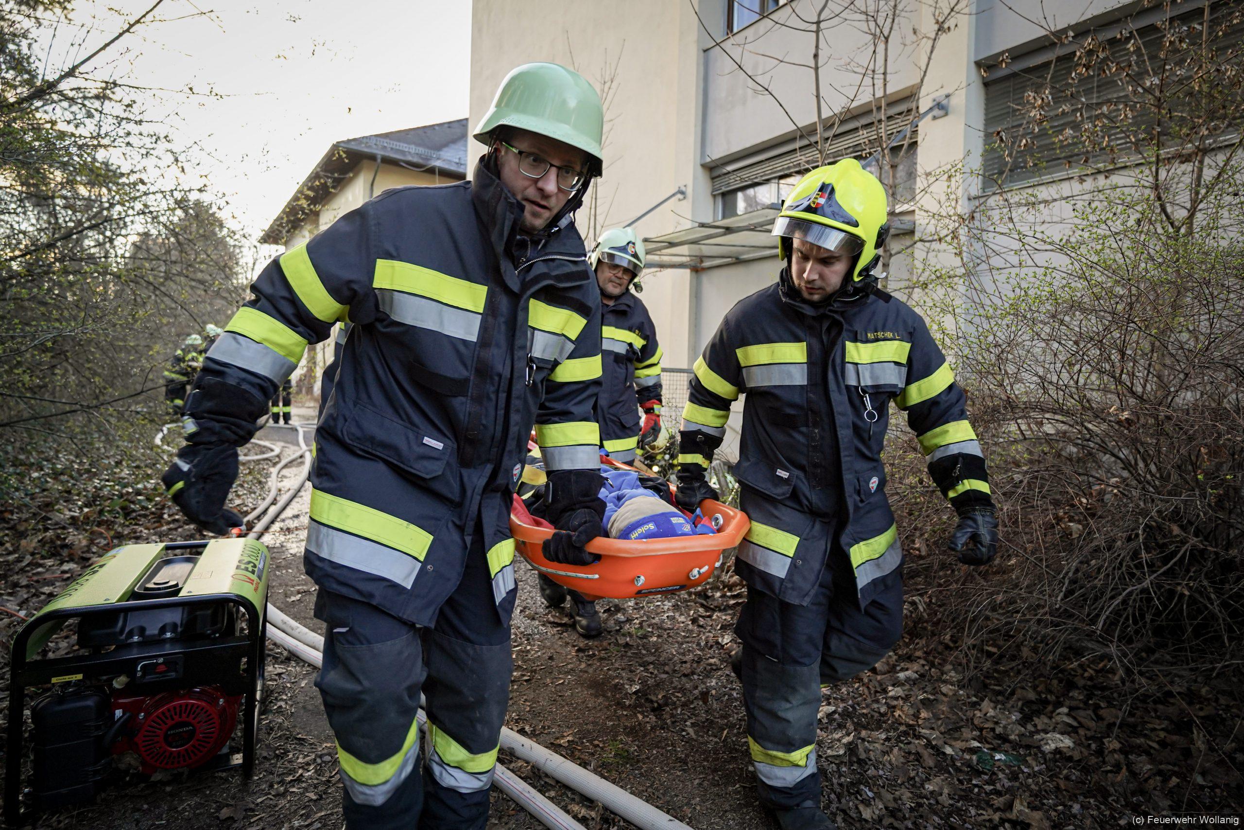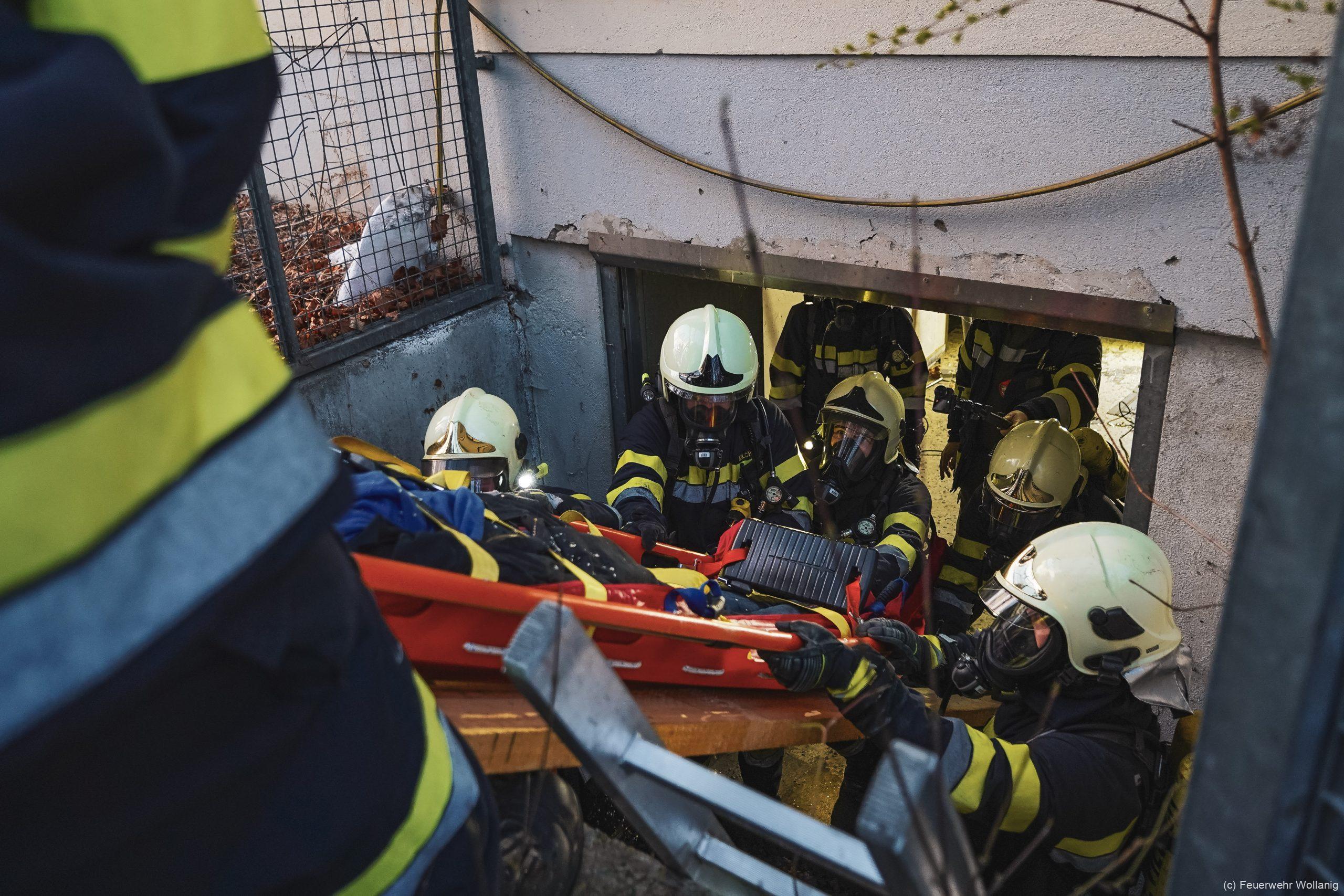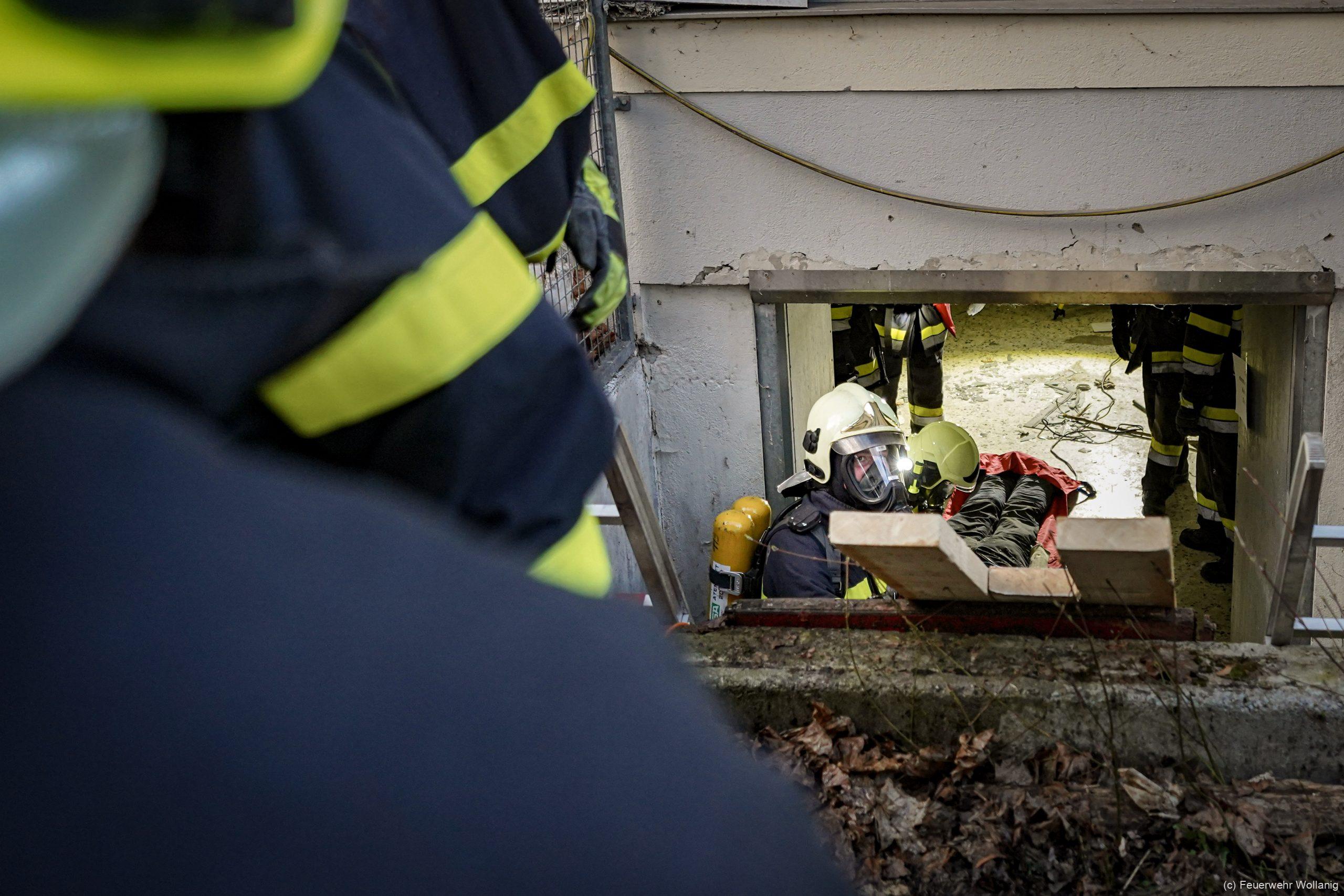 Dazu wurde der betroffene Bereich zunächst mittels Pölzen gesichert, um ein mögliches Nachgeben der Gebäudestruktur auszuschließen. Erst danach konnte die schonende Rettung der Person durchgeführt werden – ein besonders anspruchsvoller Teil der Übung.