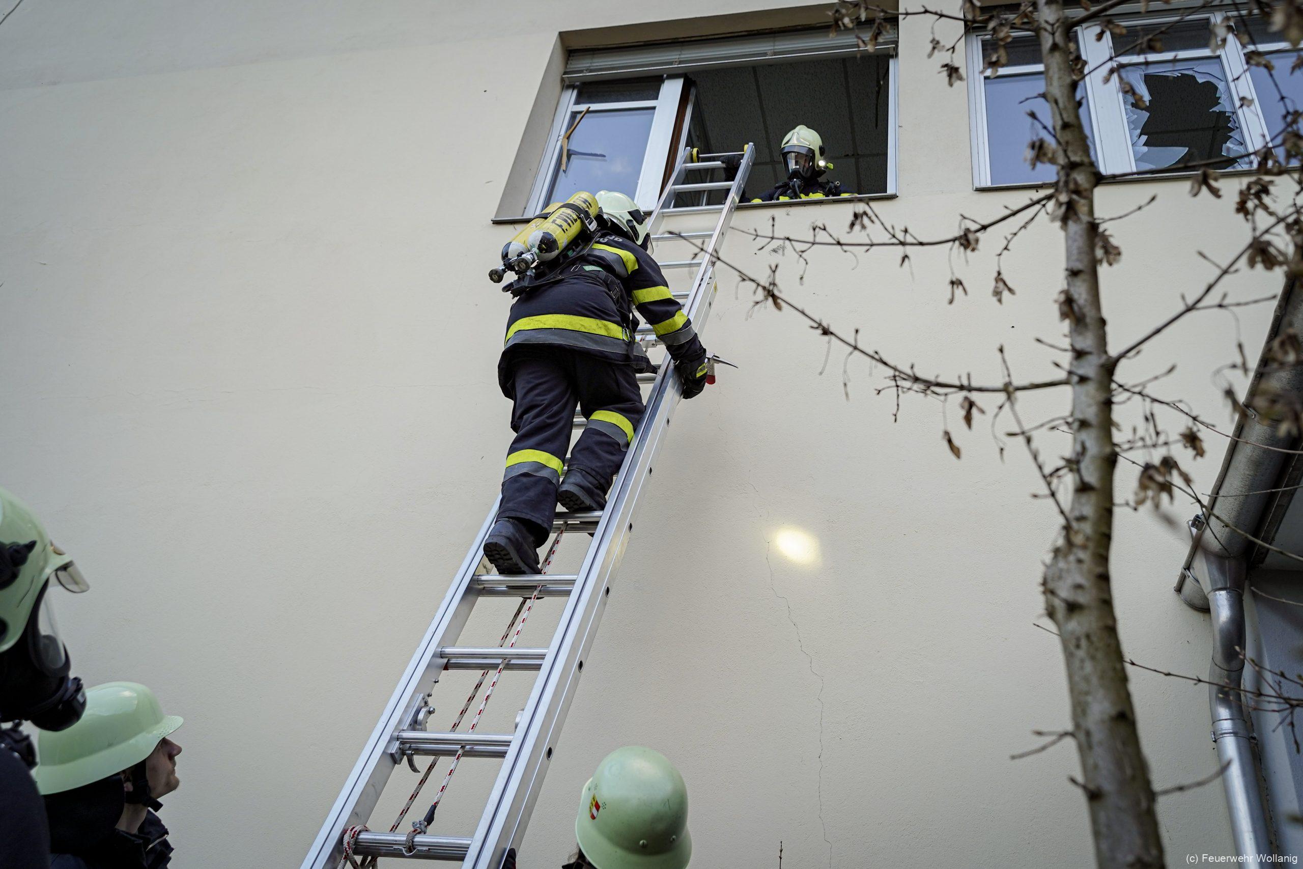 Bereits in der Anfangsphase zeigte sich die gute Zusammenarbeit der eingesetzten Kräfte. Während ein Teil der Mannschaft die Lage erkundete, wurde parallel eine Schiebeleiter in Stellung gebracht. Routiniert und zügig wurde diese aufgebaut und an einem Fenster im Obergeschoss positioniert.
